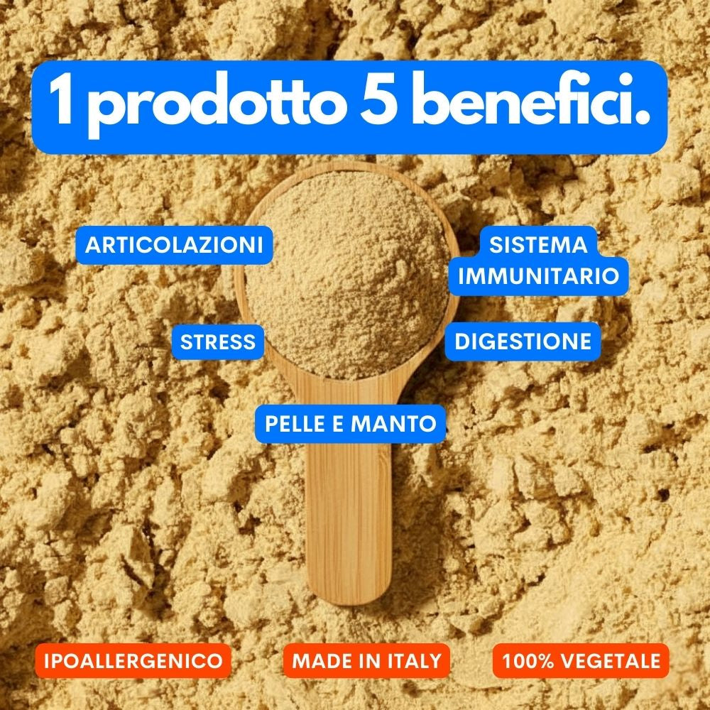 Multivitaminico 100% vegetale in polvere, ipoallergenico e super appetibile.