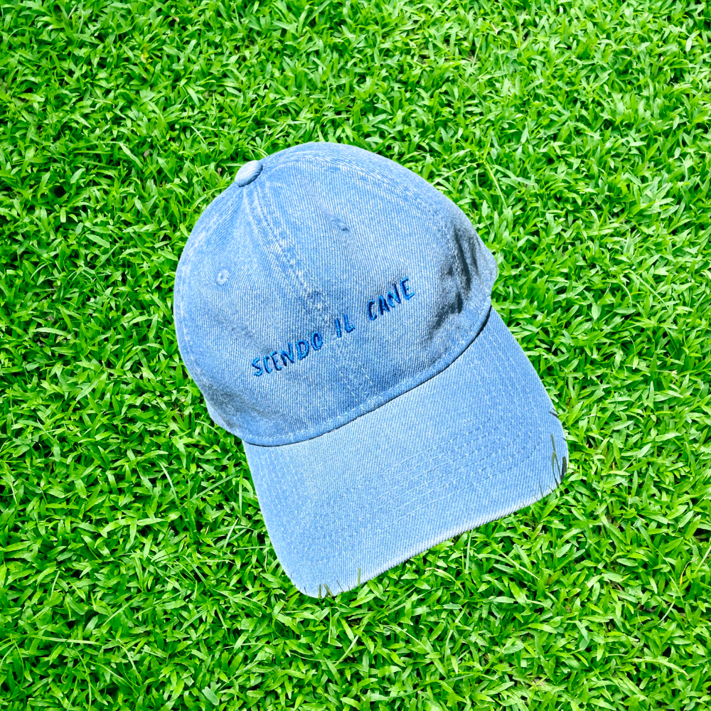 Genitori di cani moderni qui si scende il cano con stile con il cappellino in used jeans impreziosito dal claim della vita “scendo il cane” per un tocco di personalità al tuo outfit “zerosbatti scendo il cane”.